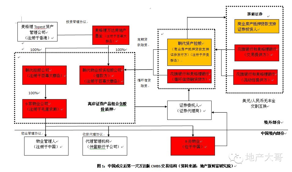 2006年,中国CMBS第一单(以下简称万达09美元浮息证券)就是王健林操刀。彼时,麦格理银行和万达的首选计划是通过REIT在香港上市,备胎是发行CMBS。REIT上市未成,王健林却打响了中国CMBS第一枪,但这一枪至今并不为国内公众所知。万达09美元浮息证券的具体内容是:万达通过特殊目的公司以在中国的9处商业房地产项目贷款为基础资产发行1.45亿美元浮动利率证券,基准利率为3个月的Libor,2012年到期。在预期到期日前,利息按季度支付,本金在预期到期日一次性付清。